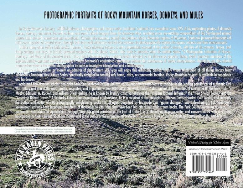 A BOOK FOR TRUE LOVERS OF EQUINES AND THE AMERICAN WEST! In Rocky Mountain Equines, wildlife-landscape photographer and nature writer Lochlainn Seabrook has assembled some 325 of his captivating photos of domestic horses, donkeys, and mules (as well as farm and ranch related images) from the American West, resulting in an eye-catching compendium of Big Sky-themed animal pictures that are both entrancing and educational. Covering the northern, central, and southern Rocky Mountain regions of Wyoming, Seabrook journeyed thousands of miles over a period of several years-through both town and wilderness and all four seasons-to photographically capture his equine subjects and their environments. Unlike many other coffee table/photography books, however, Rocky Mountain Equines is not a journalistic account of the author's travels, with lists of his cameras, lenses, and f-stop settings, nor does he include personal captions with his photos. Rather, this work is precisely what his subtitle states: A Photographic Collection of Horses, Donkeys, and Mules of the America West. Thus, this is intended to be a simple photo book dedicated to the three most popular, living, North American members of the Equidae family-one that allows the reader to enjoy Seabrook's equitatious compilation without the interference of wordy interpretations. Rounding out this colorful mammalian volume the author-photographer includes a descriptive introduction and a bibliography. If you are a hippophile, or merely an admirer of the Western U.S., you will enjoy this artistically crafted, highly visual celebration of all things horsey from Seabrook's American West Nature Series, specifically designed to beautify any home, office, or commercial location. Rocky Mountain Equines is available in paperback and hardcover. (All text copyright (c) Sea Raven Press) Award-winning historian Lochlainn Seabrook is the author and editor of over 100 books, including the international bestseller The Concise Book of Owls: A Guide to Nature's Most Mysterious Birds; as well as North America's Amazing Mammals: An Encyclopedia for the Whole Family; Rocky Mountain Bison: A Photographic Collection of Bison of the America West; and The Concise Book of Tigers: A Guide to Nature's Most Remarkable Cats.