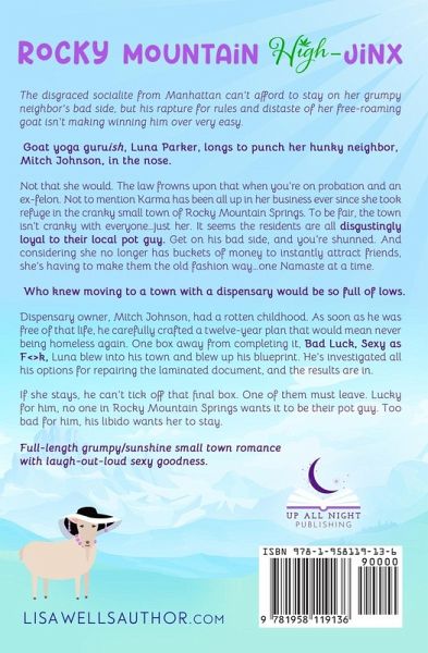 Goat yoga guruish, Luna Parker, longs to punch her hunky neighbor, Mitch Johnson, in the nose. Not that she would. The law frowns upon that when you're on probation and an ex-felon. Not to mention Karma has been all up in her business ever since she took refuge in the cranky small town of Rocky Mountain Springs. To be fair, the town isn't cranky with everyone...just her. It seems the residents are all disgustingly loyal to their local pot guy. Get on his bad side, and you're shunned. And considering she no longer has buckets of money to instantly attract friends, she's having to make them the old fashion way...one Namaste at a time. Who knew moving to a town with a dispensary would be so full of lows. Dispensary owner, Mitch Johnson, had a rotten childhood. As soon as he was free of that life, he carefully crafted a plan that would mean never being homeless again. One box away from completing it, Bad Luck Luna blew into his town and blew up his blueprint. He's investigated all his options for repairing the laminated document, and the results are in. If she stays, he can't tick off that final box. One of them must leave. Lucky for him, no one in Rocky Mountain Springs wants it to be their pot guy. Full-length grumpy/sunshine small town romance with laugh-out-loud sexy goodness.