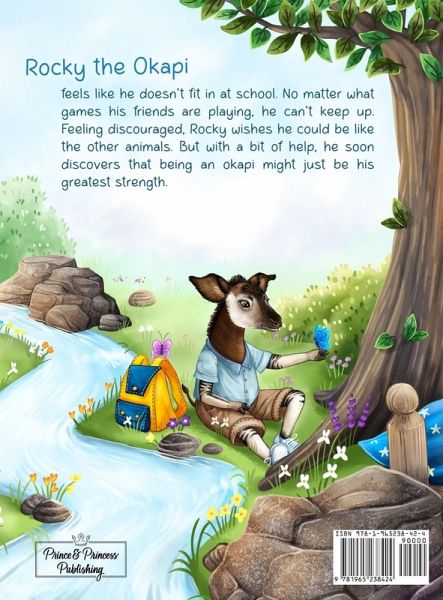 Rocky the Okapi feels like he doesn't fit in at school. No matter what games his friends are playing, he can't keep up. Feeling discouraged, Rocky wishes he could be like the other animals. But with a bit of help, he soon discovers that being an okapi might just be his greatest strength. This heartwarming story celebrates self-acceptance and reminds children that everyone has their special talents waiting to be found. Perfect for: Parents and caregivers seeking a fun and engaging story to share with their little ones. Children ages 4-8 who love unusual animals Teachers and librarians looking for heartwarming read-alouds to promote kindness and self-acceptance.