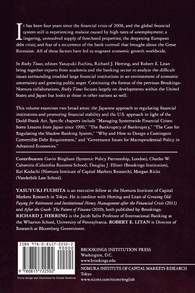 "A Brookings Institution Press and Nomura Institute of Capital Markets Research publication It has been four years since the financial crisis of 2008, and the global financial system still is experiencing malaise caused by high rates of unemployment; a lingering, unresolved supply of foreclosed properties; the deepening European debt crisis; and fear of a recurrence of the bank turmoil that brought about the Great Recession. All of these factors have led to stagnant economic growth worldwide. In Rocky Times, editors Yasuyuki Fuchita, Richard J. Herring, and Robert E. Litan bring together experts from academia and the banking sector to analyze the difficult issues surrounding troubled large financial institutions in an environment of economic uncertainty and growing public anger. Continuing the format of the previous Brookings-Nomura collaborations, Rocky Times focuses largely on developments within the United States and Japan but looks at those in other nations as well. This volume examines two broad areas: the Japanese approach to regulating financial institutions and promoting financial stability and the U.S. approach in light of the Dodd-Frank Act. Specific chapters include ""Managing Systemwide Financial Crises: Some Lessons from Japan since 1990,"" ""The Bankruptcy of Bankruptcy,"" ""The Case for Regulating the Shadow Banking System,"" ""Why and How to Design a Contingent Convertible Debt Requirement,"" and ""Governance Issues for Macroprudential Policy in Advanced Economies."" Contributors: Gavin Bingham (Systemic Policy Partnership, London), Charles W. Calomiris (Columbia Business School), Douglas J. Elliott (Brookings Institution), Kei Kodachi (Nomura Institute of Capital Markets Research), Morgan Ricks (Vanderbilt Law School)."