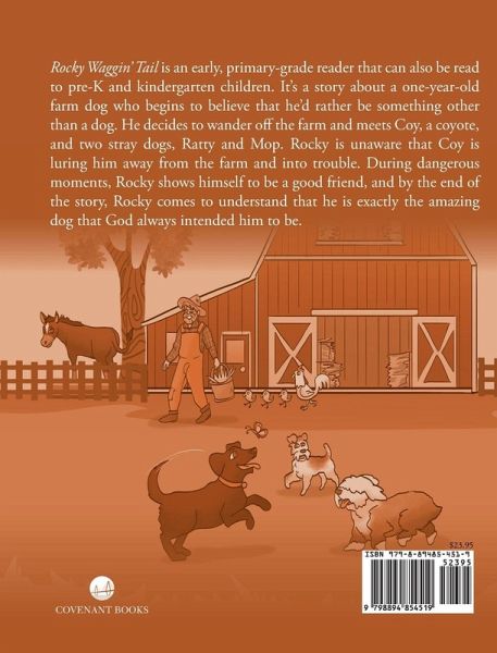 Rocky Waggin' Tail is an early, primary-grade reader that can also be read to pre-K and kindergarten children. It's a story about a one-year-old farm dog who begins to believe that he'd rather be something other than a dog. He decides to wander off the farm and meets Coy, a coyote, and two stray dogs, Ratty and Mop. Rocky is unaware that Coy is luring him away from the farm and into trouble. During dangerous moments, Rocky shows himself to be a good friend, and by the end of the story, Rocky comes to understand that he is exactly the amazing dog that God always intended him to be.