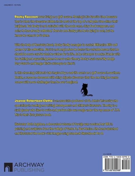 Rocky Raccoon loves living on a golf course. Morning is his favorite time because that is when the treasures hidden in his nest at the top of a tall palm tree shine their brightest. But Rocky is not satisfied with the soda cans, shiny food wrappers, and coins he has already collected. There is one flashy prize he is dying to own, but he knows he cannot do it alone. With the help of Henrietta Hawk, Rocky finally manages to snatch Billionaire Bill's cell phone for his collection. But it is not long before he learns the valuable lesson that he should be more careful what he wishes for in life. As he attempts to make friends with the talking and squawking phone he now calls Cheery, Rocky must carefully dodge Gary Gator's and Ranger Rick's attempts to find it. In this charming children's tale inspired by a real-life event on a golf course in southern Florida, a raccoon obsessed with shiny objects discovers that the one thing he wants comes with more challenges than he ever imagined.