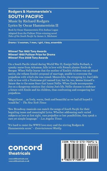 Nellie, a spunky nurse from Arkansas, falls in love with a mature French planter, Emile. Nellie learns that the mother of his children was an island native and, unable to turn her back on the prejudices with which she was raised, refuses Emile's proposal of marriage. Meanwhile, the strapping Lt. Joe Cable denies himself the fulfillment of a future with an innocent Tonkinese girl with whom he's fallen in love out of the same fears that haunt Nellie. When Emile is recruited to accompany Joe on a dangerous mission that claims Joe's life, Nellie realizes that life is too short not to seize her own chance for happiness, thus confronting and conquering her prejudices. ¿Based on Tales of the South Pacific, James Michener's collection of short stories, South Pacific opened on Broadway at the the Majestic Theatre on April 7, 1949, starring Mary Martin, Ezio Pinza and Juanita Hall. South Pacific received the 1950 Pulitzer Prize for Drama, and for the first time the committee included a composer in the drama prize. The show received ten Tony Awards (including Best Musical), a Grammy Award and countless other accolades. For years the second-longest running show in Broadway history (right behind Oklahoma!), South Pacific returned to Broadway in a celebrated 2008 revival starring Kelli O'Hara and Paolo Szot. The show has proven itself a classic in countless productions around the world and was adapted onscreen in the 1958 film starring Rossano Brazzi and Mitzi Gaynor and in a 2001 made-for-television film starring Glenn Close and Harry Connick, Jr.