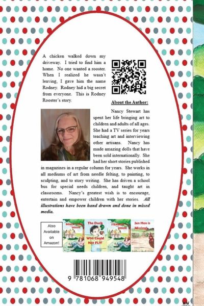A chicken walked down my driveway. I tried to find him a home. No one wanted a rooster. When I realized he wasn't leaving, I gave him the name Rodney. Rodney hid a big secret from everyone. Rodney was scrawny and malnourished, but soon he was filling out and growing into his feathers. He likes to eat noodles and vegetables. Rodney made himself right at home in our greenhouse. This is Rodney Rooster's story.
