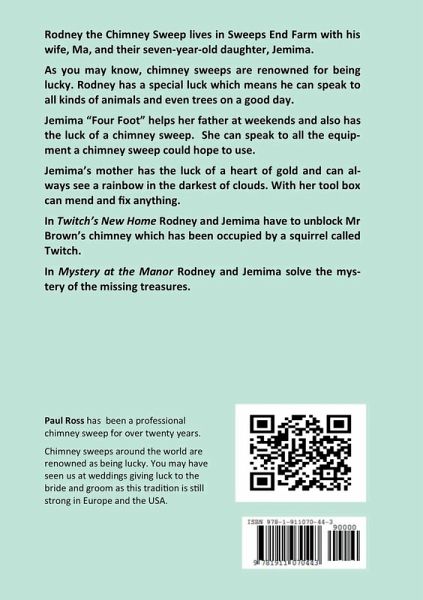 Rodney the Chimney Sweep lives in Sweeps End farm with his wife, Ma, and their seven-year-old daughter, Jemima. As you may know, chimney sweeps are renowned as being lucky. Rodney has a special luck which means he can speak to all kinds of animals and birds. Jemima "Four Foot" helps her father at weekends and also has the luck of a chimney sweep. She can speak to all the equipment a chimney sweep could hope to use. Jemima's mother, Ma, has the luck of a heart of gold and can always see a rainbow in the darkest of clouds and with her tool box can mend and fix anything. In Twitch's New Home Rodney and Jemima have to unblock Mr Brown's Chimney which has been occupied by a squirrel called Twitch. In Mystery at the Manor Rodney and Jemima solve the mystery of the missing treasures.