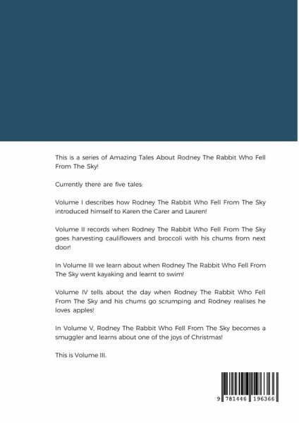 This is a series of Amazing Tales About Rodney The Rabbit Who Fell From The Sky! Currently there are five tales: Volume I describes how Rodney The Rabbit Who Fell From The Sky introduced himself to Karen the Carer and Lauren! Volume II records when Rodney The Rabbit Who Fell From The Sky goes harvesting cauliflowers and broccoli with his chums from next door! In Volume III we learn about when Rodney The Rabbit Who Fell From The Sky went kayaking and learnt to swim! Volume IV tells about the day when Rodney The Rabbit Who Fell From The Sky and his chums go scrumping and Rodney realises he loves apples! In Volume V, Rodney The Rabbit Who Fell From The Sky becomes a smuggler and learns about one of the joys of Christmas! This is Volume III.