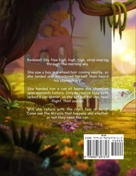 Rodowell Sky flew high, high, high, while soaring through the morning sky. She saw a boy coming nearby, so she landed and introduced herself then heard his stomach cry. She handed him a can of beans she stumbled upon moments before. Only to realize they both lacked a can opener, so she set out for one, took flight, then soared. Will she return with the right tool in hand? Come see the Miracle that happens and whether or not they open the can.