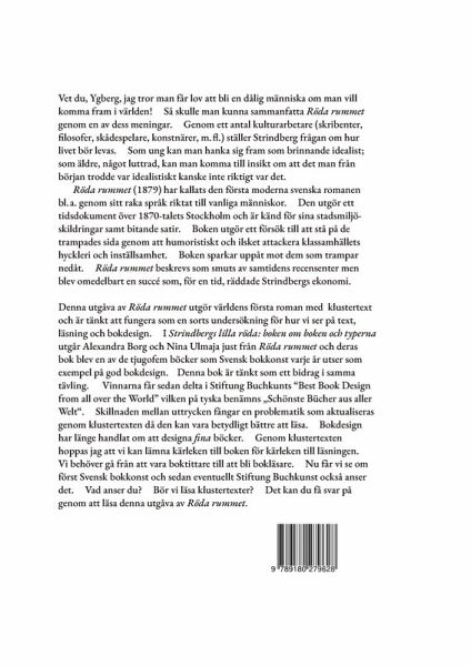 Vet du, Ygberg, jag tror man får lov att bli en dålig människa om man vill komma fram i världen! Så skulle man kunna sammanfatta Röda rummet genom en av dess meningar. Genom ett antal kulturarbetare ställer Strindberg frågan om hur livet bör levas. Röda rummet (1879) har kallats den första moderna svenska romanen och utgör ett tidsdokument över 1870-talets Stockholm. Den är känd för sina stadsmiljöskildringar och bitande satir. Boken utgör ett försök till att stå på de trampades sida genom att humoristiskt och ilsket attackera klassamhällets hyckleri och inställsamhet. Röda rummet beskrevs som smuts av samtidens recensenter men blev omedelbart en succé. Denna utgåva av Röda rummet är världens första roman med klustertext och är tänkt att fungera som en sorts undersökning för hur vi ser på bokdesign. I Strindbergs lilla röda: boken om boken och typerna utgår man just från Röda rummet och boken blev en av de tjugofem böcker som Svensk bokkonst varje år utser som exempel på god bokdesign. Denna bok är tänkt som ett bidrag i samma tävling. Vinnarna får sedan delta i Stiftung Buchkunts Best Book Design from all over the World vilken på tyska benämns Schönste Bücher aus aller Welt. Skillnaden mellan uttrycken fångar vad som aktualiseras genom klustertexten då den kan vara betydligt bättre att läsa. Bokdesign har länge handlat om att designa fina böcker. Genom klustertexten hoppas jag att vi kan lämna kärleken till boken för kärleken till läsningen. Vi behöver gå från att vara boktittare till att bli bokläsare. Nu får vi se om först Svensk bokkonst och sedan eventuellt Stiftung Buchkunst också anser det. Vad anser du? Bör vi läsa klustertexter? Det kan du få svar på genom att läsa denna utgåva av Röda rummet. Observera att denna text inte kan flödas om och därför behöver läsas på läsplattor som är minst 13 tum vilka klarar en radlängd på 95 tecken (mindre skärmar är alltså olämpliga). Bonusmaterial: August Strindbergs Lilla katekes för Underklassen.