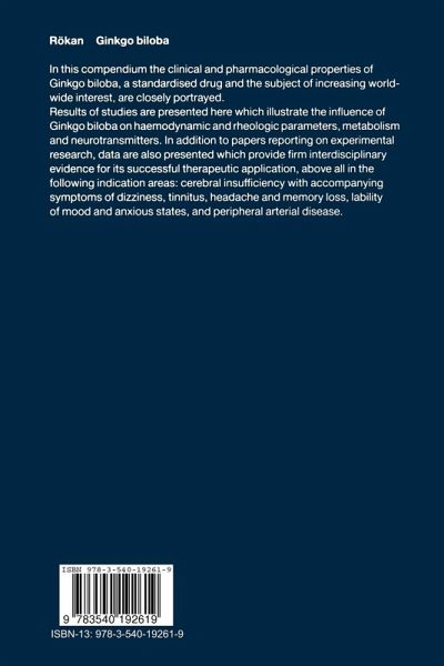 In this compendium the clinical and pharmacological properties of Ginkgo biloba, a standardized drug and the subject of increasing worldwide interest, are closely portrayed. Results of studies are presented here which illustrate the influence of Ginkgo on haemodynamic and rheologic parameters, metabolism and neurotransmitters. In addition to papers reporting on experimental research, data are also presented which provide firm interdisciplinary evidence for its successful therapeutic application, above all in the following indication areas: cerebral insufficiency with accompanying symptoms of dizziness, tinnitus, headache and memory loss, lability of mood and anxious states, and peripheral arterial disease.