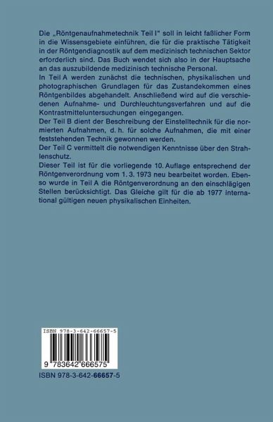 A) Allgemeine Grundlagen.- I. Die Erzeugung von Röntgenstrahlen.- II. Die Belastbarkeit der Röntgenröhre.- III. Die wichtigsten Eigenschaften der Röntgenstrahlen.- IV. Das Zustandekommen des Röntgenbildes bei Aufnahme und Durchleuchtung.- V. Projektionsverhältnisse.- VI. Die photographischen Grundlagen.- VII. Die Dunkelkammer und die Dunkelkammerarbeit.- VIII. Die Güte des Röntgenbildes.- IX. Die praktische Anfertigung des Röntgenbildes und die Hilfeleistung bei Durchleuchtungen.- X. Die Aufnahme- und Durchleuchtungsverfahren.- XI. Die Kontrastmethoden.- B) Die normierten Röntgenaufnahmen.- I. Allgemeine Vorbemerkungen.- II. Übersicht über die Aufnahmeeinstellungen.- C) Der Strahlenschutz in Röntgenbetrieben.- I. Dosisgrößen und Dosiseinheiten.- II. Spezielle Dosisbegriffe für die medizinische Anwendung.- III. Die Dosismessung.- IV. Biologische Grundlagen der Strahlenwirkung.- V. Spezielle Strahlenschutzbegriffe.- VI. Gesetzliche Strahlenschutzvorschriften und Normen.- VII. Praktische Regeln für den Strahlenschutz in röntgendiagnostischen Betrieben.