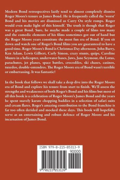 Modern Bond retrospectives lazily tend to almost completely dismiss Roger Moore's tenure as James Bond. He is frequently called the 'worst' Bond and his movies are dismissed as Carry On style romps. Roger would even make light of this himself. The truth is though that Roger was a great Bond. Sure, he maybe made a couple of films too many and the comedic elements of his films sometimes got out of hand but the Roger Moore years constitute the most fun era of Bond. If you sit down and watch one of Roger's Bond films you are guaranteed to have a good time. Roger Moore's Bond is Christmas Day afternoon. John Barry, Ken Adam, Lewis Gilbert, Carly Simon, crazy stunts, quips, Caroline Munro in a helicopter, underwater bases, Jaws, Jane Seymour, the Lotus, parachutes, jet planes, space battles, crocodiles, ski chases, casinos, tuxedos, double-entendres. The Roger Moore era of Bond wasn't terrible or embarrassing. It was fantastic! In the book that follows we shall take a deep dive into the Roger Moore era of Bond and explore his tenure from start to finish. We'll assess the strengths and weaknesses of both Roger's Bond and his films but most of all this book is a celebration of Roger Moore's James Bond and the years he spent suavely karate chopping baddies in a selection of safari suits and cream flares. Roger's amazing contribution to the Bond franchise is far too often derided and mocked these days. This book will hopefully serve as an entertaining and robust defence of Roger Moore and his incarnation of James Bond.