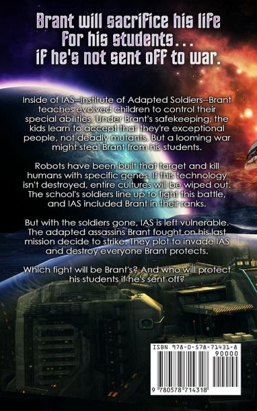 X-Men's School for the Gifted... in space Inside IAS--Institute of Adapted Soldiers--Brant teaches evolved children to control their special abilities. Under Brant's safekeeping, the kids learn to accept that they're exceptional people, not deadly mutants. But a looming war might steal Brant from his students. Robots have been built that target and kill humans with specific genes. If this technology isn't destroyed, entire cultures will be wiped out. The school's soldiers line up to fight this battle, and IAS included Brant in their ranks. But with the soldiers gone, IAS is left vulnerable. The adapted assasins Brant fought on his last mission decide to strike. They plot to invade IAS and destroy everyone Brant protects. Which fight will be Brant's? And who will protect his students if he's sent off?