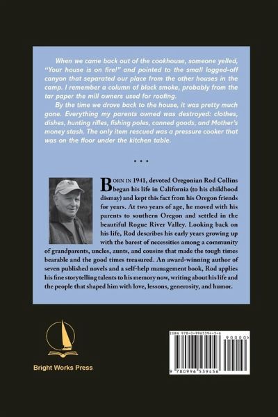 When we came back out of the cookhouse, someone yelled, "Your house is on fire!" and pointed to the small logged-off canyon that separated our place from the other houses in the camp. I remember a column of black smoke, probably from the tar paper the mill owners used for roofing. By the time we drove back to the house, it was pretty much gone. Everything my parents owned was destroyed: clothes, dishes, hunting rifles, fishing poles, canned goods, and Mother's money stash. The only item rescued was a pressure cooker that was on the floor under the kitchen table. *** Born in 1941, devoted Oregonian Rod Collins began his life in California (to his childhood dismay) and kept this fact from his Oregon friends for years. At two years of age, he moved with his parents to southern Oregon and settled in the beautiful Rogue River Valley. Looking back on his life, Rod describes his early years growing up with the barest of necessities among a community of grandparents, uncles, aunts, and cousins that made the tough times bearable and the good times treasured. An award-winning author of seven published novels and a self-help management book, Rod applies his fine storytelling talents to his memory now, writing about his life and the people that shaped him with love, lessons, generosity, and humor.