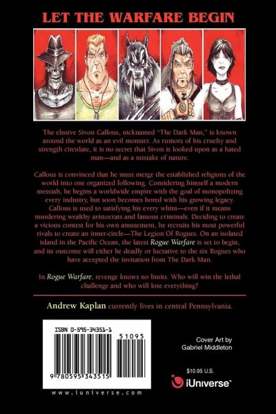 The elusive Sivon Callous, nicknamed "The Dark Man," is known around the world as an evil monster. As rumors of his cruelty and strength circulate, it is no secret that Sivon is looked upon as a hated man--and as a mistake of nature. Callous is convinced that he must merge the established religions of the world into one organized following. Considering himself a modern messiah, he begins a worldwide empire with the goal of monopolizing every industry, but soon becomes bored with his growing legacy. Callous is used to satisfying his every whim--even if it means murdering wealthy aristocrats and famous criminals. Deciding to create a vicious contest for his own amusement, he recruits his most powerful rivals to create an inner-circle--The Legion Of Rogues. On an isolated island in the Pacific Ocean, the latest Rogue Warfare is set to begin, and its outcome will either be deadly or lucrative to the six Rogues who have accepted the invitation from The Dark Man. In Rogue Warfare, revenge knows no limits. Who will win the lethal challenge and who will lose everything?