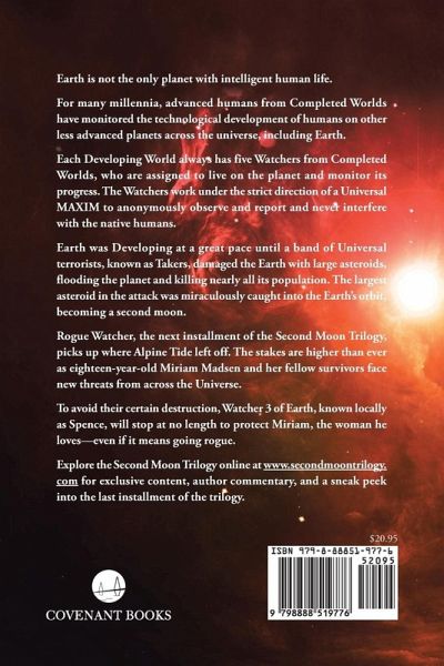 Earth is not the only planet with intelligent human life. For many millennia, advanced humans from Completed Worlds have monitored the technological development of humans on other less advanced planets across the universe, including Earth. Each Developing World always has five Watchers from Completed Worlds, who are assigned to live on the planet and monitor its progress. The Watchers work under the strict direction of a Universal MAXIM to anonymously observe and report and never interfere with the native humans. Earth was Developing at a great pace until a band of Universal terrorists, known as Takers, damaged the Earth with large asteroids, flooding the planet and killing nearly all its population. The largest asteroid in the attack was miraculously caught into the Earth's orbit, becoming a second moon. Rogue Watcher, the next installment of the Second Moon Trilogy, picks up where Alpine Tide left off. The stakes are higher than ever as eighteen-year-old Miriam Madsen and her fellow survivors face new threats from across the Universe. To avoid their certain destruction, Watcher 3 of Earth, known locally as Spence, will stop at no length to protect Miriam, the woman he loves--even if it means going rogue. Explore the Second Moon Trilogy online at www.secondmoontrilogy.com for exclusive content, author commentary, and a sneak peek into the last installment of the trilogy.