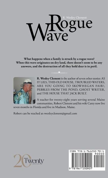 What happens when a family is struck by a rogue wave?When this wave originates on dry land, there doesn't seem to be any answers, and the destruction of all they hold dear is in peril. R. Wesley Clement is the author of seven other stories: AS IT LIES, THIS OLD HOUSE, TROUBLED WATERS, ARE YOU GOING TO SKOWHEGAN FAIR?, PEBBLES FROM THE POND, GHOST WRITER, and THE HOUSE THAT JACK BUILT. A teacher for twenty-eight years serving several Maine communities, Robert Clement and his wife Carey now live seven months in Florida and five in Madison, Maine. Robert can be reached at rwesleyclement@gmail.com