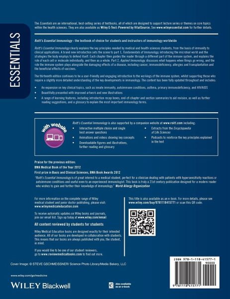 Roitt's Essential Immunology clearly explains the key principles needed by medical and health sciences students, from the basis of immunity to clinical applications. A brand new introduction sets the scene to section 1, Fundamentals of Immunology, introducing the microbial world and the strategies the body employs to defend itself. Each chapter then guides the reader through a different part of the immune system, and explains the role of each cell or molecule individually, and then as a whole. Section 2, Applied Immunology, discusses what happens when things go wrong, and the role the immune system plays alongside the damaging effects of a disease, including cancer, immunodeficiency, allergies and transplantation and the beneficial effects of vaccines.