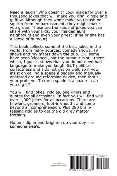 Need a laugh? Who doesn't? Look inside for a random collection of hundreds of jokes that will make you grin, giggle and guffaw. These are the kinds of jokes you can share with your kids, your maiden aunt and even your priest (if he or she has a sense of humour). This book collects some of the best jokes in the world, from many sources, comedy shows and my mates down the pub. OK, some have been 'cleaned', but the humor is still there which, I guess, shows that you do not need strong language to make you laugh. You will find well over 1000 jokes, 280 riddles and 100 quotes for all occasions. There are howlers, groaners, one-liners, quotes, foot-in-mouth, and some beyond all comprehension. Go on - dip in and brighten your day - or someone else's.