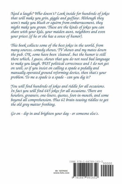 Need a laugh? Who doesn't? Look inside for hundreds of jokes that will make you grin, giggle and guffaw. These are the kinds of jokes you can share with your kids, your maiden aunt and even your priest (if he or she has a sense of humour). This book collects some of the best jokes in the world, from many sources, comedy shows and my mates down the pub. OK, some have been 'cleaned', but the humour is still there which, I guess, shows that you do not need bad language to make you laugh. BUT political correctness and I do not get on well, so if you insist on calling a spade a pedally and manually operated ground reforming device, then that's your problem. You will find hundreds of jokes and riddle for all occasions. In fact you will find 645 jokes for all occasions. There are howlers, groaners, one-liners, quotes, foot-in-mouth, and some beyond all comprehension. Plus 62 brain-teasing riddles to get the old grey matter frothing. Go on - dip in and brighten your day - or someone else's.