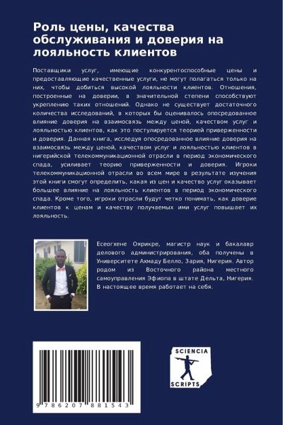 Postawschiki uslug, imeüschie konkurentosposobnye ceny i predostawlqüschie kachestwennye uslugi, ne mogut polagat'sq tol'ko na nih, chtoby dobit'sq wysokoj loql'nosti klientow. Otnosheniq, postroennye na dowerii, w znachitel'noj stepeni sposobstwuüt ukrepleniü takih otnoshenij. Odnako ne suschestwuet dostatochnogo kolichestwa issledowanij, w kotoryh by oceniwalos' oposredowannoe wliqnie doweriq na wzaimoswqz' mezhdu cenoj, kachestwom uslug i loql'nost'ü klientow, kak äto postuliruetsq teoriej priwerzhennosti i doweriq. Dannaq kniga, issleduq oposredowannoe wliqnie doweriq na wzaimoswqz' mezhdu cenoj, kachestwom uslug i loql'nost'ü klientow w nigerijskoj telekommunikacionnoj otrasli w period äkonomicheskogo spada, usiliwaet teoriü priwerzhennosti i doweriq. Igroki telekommunikacionnoj otrasli wo wsem mire w rezul'tate izucheniq ätoj knigi smogut opredelit', kakaq iz cen i kachestwo uslug okazywaet bol'shee wliqnie na loql'nost' klientow w period äkonomicheskogo spada. Krome togo, igroki otrasli budut chetko ponimat', kak dowerie klientow k cenam i kachestwu poluchaemyh imi uslug powyshaet ih loql'nost'.