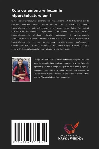 We wspó¿czesnej medycynie hipercholesterolemia zaliczana jest do dyslipidemii. Jest to obecno¿¿ wysokiego poziomu cholesterolu we krwi. W dzisiejszych czasach hipercholesterolemia jest niebezpiecznym problemem w¿ród ludzi. Aby poznä skuteczno¿¿ Cinnamomum zeylanicum i Cinnamomum tamala w leczeniu hipercholesterolemii, zbadano etiologi¿, patogenez¿ i symptomatologi¿ hipercholesterolemii zgodnie z ajurwed¿ i wspó¿czesn¿ nauk¿. ¿¿cznie 30 pacjentów z hipercholesterolemi¿ leczono sproszkowan¿ kor¿ Cinnamomum zeylanicum i Cinnamomum tamala, 1 g dwa razy dziennie przez 3 miesi¿ce. Wyniki oceniano pod k¿tem poprawy klinicznej, z¿agodzenia objawów i oceny profilu lipidowego.