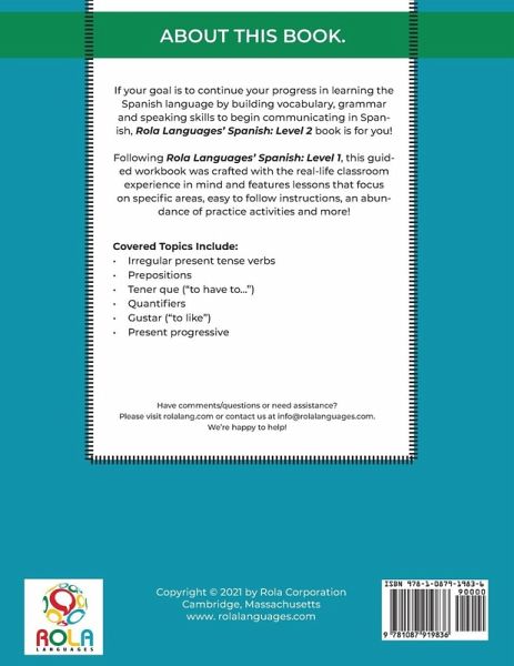 If your goal is to continue your progress in learning the Spanish language by building vocabulary, grammar and speaking skills to begin communicating in Spanish, Rola Languages' Spanish: Level 2 book is for you! Following Rola Languages' Spanish: Level 1, this guided workbook was crafted with the real-life classroom experience in mind with lessons that focus on specific areas, easy to follow instructions, practice activities and more! In Rola's Spanish: Level 2 book you will find: 6 Unique and Informative Chapters: Each chapter focuses on a set of vocabulary and grammar concepts that give you the tools to start speaking Spanish in a practical way. Contextual Vocabulary: Each chapter leads with vocab introductions and translations which are also present within the readings and exercises that follow. Global Spanish Perspective: This book presents a global perspective of the Spanish language including key information about Castilian Spanish (from Spain), but focuses on a broader view of the Spanish-speaking world of Central and South America. Multidisciplinary and Interactive Sections: Each chapter consists of 7 sections focused on the areas of vocabulary, grammar, readings, exercises and review. Real Life Context: Readings are incorporated throughout to provide situational context and help build comprehension skills. Practice Exercises: Each chapter has guided lessons to put your learning to the test and build on the skills and concepts acquired. Rola Respuesta Rápida: Each chapter ends with a section that reviews the material and puts the concepts learned together; a cornerstone of the Rola Method. Answer Key: An answer key is included in the back of the book, allowing the user to check their progress along the way. The Rola Method is a progressive teaching method that promotes fluency through repetition. With the needs of our adult students in mind, it was designed to increase retention and confidence. Our method focuses on 3 parts and is reflected in the structure and exercises:Vocabulary Building/Repetition Verb Drills/Grammar General Conversation/Fluency This textbook provides a solid foundation of basic vocabulary and grammatical structure of the Spanish language, including real-life examples to contextualize concepts learned for day-to-day application. With this workbook, you will be on your way to becoming a Spanish speaker in no time! <