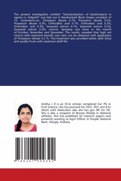 The present investigation entitled "Standardization of biostimulants in sapota cv. Kalipatti" was laid out in Randomized Block Design consisted of 10 treatments viz., Potassium silicate 0.1%, Potassium silicate 0.2%, Potassium silicate 0.3%, Orthosilicic acid 0.1%, Orthosilicic acid 0.2%, Orthosilicic acid 0.3%, Seaweed extract 0.1%, Seaweed extract 0.2%, Seaweed extract 0.3%, control. Spraying was done in the month of October, November and December. The results, revealed that high net returns with maximum benefit cost ratio can be obtained with application of Potassium Silicate 0.2 %. This treatment also provided better yield (t/ha) and quality fruits with maximum shelf life.