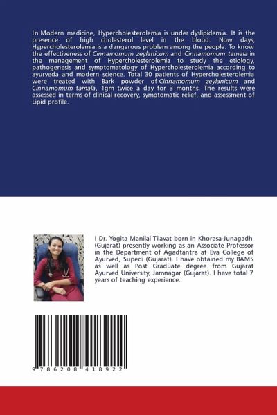 In Modern medicine, Hypercholesterolemia is under dyslipidemia. It is the presence of high cholesterol level in the blood. Now days, Hypercholesterolemia is a dangerous problem among the people. To know the effectiveness of Cinnamomum zeylanicum and Cinnamomum tamala in the management of Hypercholesterolemia to study the etiology, pathogenesis and symptomatology of Hypercholesterolemia according to ayurveda and modern science. Total 30 patients of Hypercholesterolemia were treated with Bark powder of Cinnamomum zeylanicum and Cinnamomum tamala, 1gm twice a day for 3 months. The results were assessed in terms of clinical recovery, symptomatic relief, and assessment of Lipid profile.