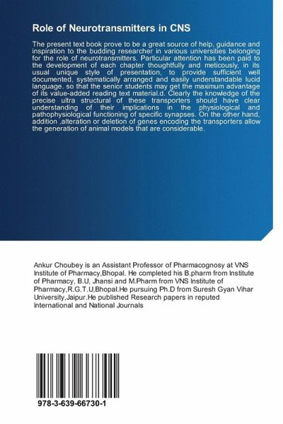The present text book prove to be a great source of help, guidance and inspiration to the budding researcher in various universities belonging for the role of neurotransmitters. Particular attention has been paid to the development of each chapter thoughtfully and meticously, in its usual unique style of presentation, to provide sufficient well documented, systematically arranged and easily understandable lucid language. so that the senior students may get the maximum advantage of its value-added reading text material.d. Clearly the knowledge of the precise ultra structural of these transporters should have clear understanding of their implications in the physiological and pathophysiological functioning of specific synapses. On the other hand, addition ,alteration or deletion of genes encoding the transporters allow the generation of animal models that are considerable.