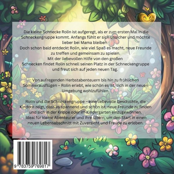 Rolin, der kleine Schneckenjunge, erlebt einen großen Schritt in seinem Leben: den ersten Tag in der Schneckengruppe. Anfangs ist Rolin ängstlich und möchte bei Mama bleiben, doch mit der Unterstützung der liebevollen großen Schnecken findet er schnell neue Freunde und spannende Abenteuer. Ob beim Laubfest im Herbst oder beim Schneemännchen bauen im Winter - Rolin entdeckt die Freude am gemeinsamen Spielen und Lernen. Diese herzerwärmende Geschichte begleitet Kinder und ihre Eltern auf dem Weg in die Krippe oder den Kindergarten und zeigt, dass neue Erfahrungen oft viel Spass und wundervolle Freundschaften mit sich bringen.