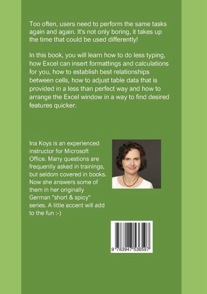 Too often, users need to perform the same tasks again and again. It's not only boring, it takes up the time that could be used differently! In this book, you will learn: how to do less typing, how Excel can insert formattings and calculations for you, how to establish best relationships between cells, how to adjust table data, that is provided in a less than perfect way and how to arrange the Excel window in a way to find desired features quicker. After that, you will know how to make Excel follow your intentions. And if you want even more, you are now ready to dive into the more advanced features!