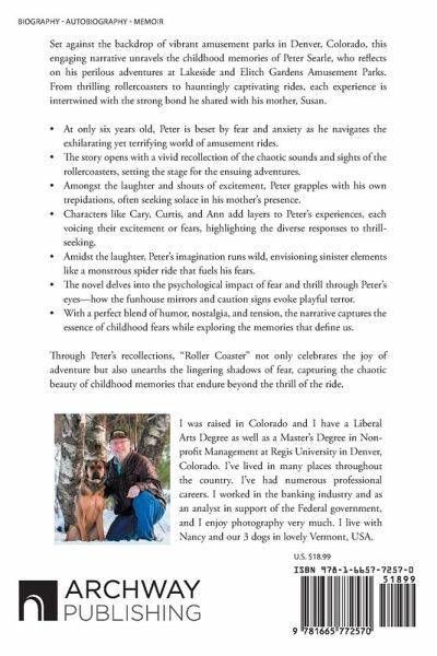 Roller Coaster is a powerful, heartfelt journey through the life of Peter Searle-a story of resilience, reflection, and the pursuit of meaning. Set against the backdrop of Denver's iconic amusement parks, young Peter confronts his deepest fears, finding comfort in his mother's love while haunted by dreams and the belief in alien forces. Amid the chaos of a turbulent household ruled by a controlling uncle, Peter clings to moments of joy and the grounding influence of his grandfather, whose moral strength and faith shape Peter's emerging values. The loss of this guiding figure becomes a catalyst for Peter's inner transformation. Through vivid memories, cosmic wonder, and emotional struggles-including battles with blindness and cancer-Peter's life becomes a testament to endurance. As he matures, he uncovers beauty in the everyday and strength in legacy, striving to reconcile trauma with purpose. Infused with humor, nostalgia, and emotional depth, Roller Coaster captures the highs and lows of a life shaped by childhood wonder, family complexity, and the enduring hope for something greater. This is the first installment of Peter's story-a compelling exploration of how one man learns to rise above adversity and embrace the unpredictable Roller Coaster of life.