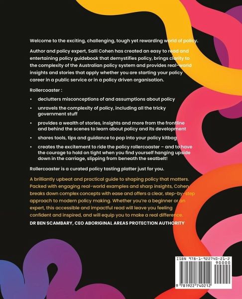 Welcome to the exciting, challenging, tough yet rewarding world of policy. Author and policy expert, Salli Cohen has created an easy to read and entertaining policy guidebook that demystifies policy, brings clarity to the complexity of the Australian policy system and provides real-world insights and stories that apply whether you are starting your policy career in a public service or in a policy driven organisation. Foreword by Mick Gooda, former Aboriginal and Torres Strait Islander Social Justice Commissioner, Australian Human Rights Commissioner Rollercoaster :declutters misconceptions of and assumptions about policy unravels the complexity of policy, including all the tricky government stuff provides a wealth of stories, insights and more from the frontline and behind the scenes to learn about policy and its development shares tools, tips and guidance to pop into your policy kitbag creates the excitement to ride the policy rollercoaster - and to have the courage to hold on tight when you find yourself hanging upside down in the carriage, slipping from beneath the seatbelt! Rollercoaster is the toolkit you need to become a bloody good policy officer. "This is not a dull how to do policy manual, rather Salli drops in large dollops of wisdom, evidence and experience, guiding and challenging us along the rollercoaster process of policy in its different settings." Dr Maggie Jamieson "Rollercoaster is a policy bible. The book is written in a way that is accessible to all and includes valuable sections at the end of each chapter with key takeaway messages and calls to action." Dr Lorraine Cherney, Deputy Director Regulatory Practice, ANZSOG