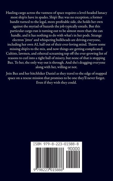 Hauling cargo across the vastness of space requires a level-headed lunacy most ship'rs have in spades. Ship'r Bax was no exception; a former bandit turned to the legal, more profitable side, she holds her own against the myriad of hazards the job typically entails. But this particular cargo run is turning out to be almost more than she can handle, and it has nothing to do with what's in her pods. Strange electron 'jitter' and whispering bulkheads are driving everyone, including her own AI, half out of their ever-loving mind. Throw some missing ship'rs to the mix, and now things are getting complicated. Cultists, lawmen, and ethereal screaming top off the ever-growing list of reasons to curl into a tight ball of misery, but none of that is stopping Bax. To her, the only way out is through. And she's dragging everyone along with her, willing or not. Join Bax and her hitchhiker Daniel as they travel to the edge of mapped space on a rescue mission that promises to be one they'll never forget. Even if they wish they could.
