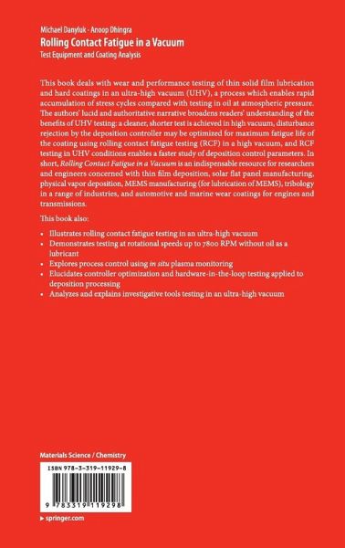 This book deals with wear and performance testing of thin solid film lubrication and hard coatings in an ultra-high vacuum (UHV), a process which enables rapid accumulation of stress cycles compared with testing in oil at atmospheric pressure. The authors' lucid and authoritative narrative broadens readers' understanding of the benefits of UHV testing: a cleaner, shorter test is achieved in high vacuum, disturbance rejection by the deposition controller may be optimized for maximum fatigue life of the coating using rolling contact fatigue testing (RCF) in a high vacuum, and RCF testing in UHV conditions enables a faster study of deposition control parameters. In short, Rolling Contact Fatigue in a Vacuum is an indispensable resource for researchers and engineers concerned with thin film deposition, solar flat panel manufacturing, physical vapor deposition, MEMS manufacturing (for lubrication of MEMS), tribology in a range of industries, and automotive and marine wear coatings forengines and transmissions.