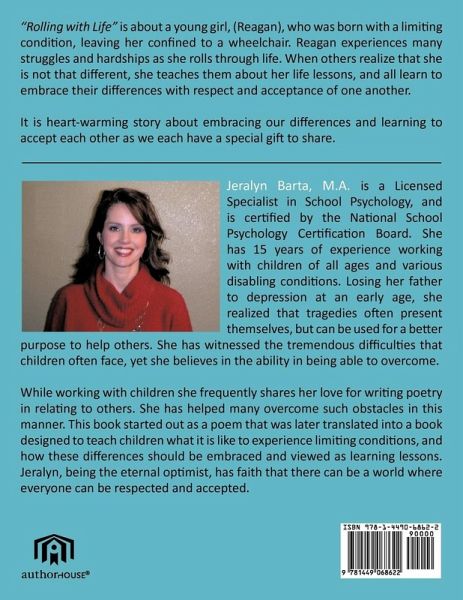 "Rolling with Life" is about a young girl, (Reagan), who was born with a limiting condition, leaving her confined to a wheelchair. Reagan experiences many struggles and hardships as she rolls through life. When others realize that she is not that different, she teaches them about her life lessons, and all learn to embrace their differences with respect and acceptance of one another. It is heart-warming story about embracing our differences and learning to accept each other as we each have a special gift to share.