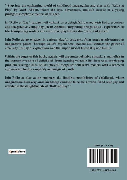 " Step into the enchanting world of childhood imagination and play with "Rollo at Play" by Jacob Abbott, where the joys, adventures, and life lessons of a young protagonist captivate readers of all ages. In "Rollo at Play," readers will embark on a delightful journey with Rollo, a curious and imaginative young boy. Jacob Abbott's storytelling brings Rollo's experiences to life, transporting readers into a world of playfulness, discovery, and growth. Join Rollo as he engages in various playful activities, from outdoor adventures to imaginative games. Through Rollo's experiences, readers will witness the power of creativity, the joy of exploration, and the importance of friendship and family. Within the pages of this book, readers will encounter relatable situations and relish in the innocent wonder of childhood. From learning valuable life lessons to developing problem-solving skills, Rollo's playful escapades will leave readers with a renewed appreciation for the simplicity and magic of youth. Join Rollo at play as he embraces the limitless possibilities of childhood, where imagination, discovery, and friendship combine to create a world filled with joy and wonder in the delightful tale of "Rollo at Play.""