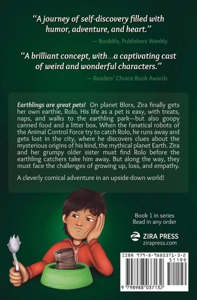 Earthlings are great pets! On planet Blorx, Zira finally gets her own earthie, Rolo. His life as a pet is easy, with treats, naps, and walks to the earthling park-but also goopy canned food and a litter box. When the fanatical robots of the Animal Control Force try to catch Rolo, he runs away and gets lost in the city, where he discovers clues about the mysterious origins of his kind, the mythical planet Earth. Zira and her grumpy older sister must find Rolo before the earthling catchers take him away. But along the way, they must face the challenges of growing up, loss, and empathy. A cleverly comical adventure in an upside-down world.