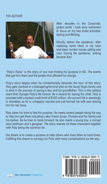 "Roly's Rules" is the story of one man finding his purpose in life. The events that got him there and the people that affected his change. Roly's story begins when he unintentionally becomes the hero of this story. Roly gets involved in a kidnapping/terrorist plot on the Saudi Royal family and is shot in the process of saving a boy and his grandfather. This is the catalyst event that changes Roly's life forever. As a reward for saving the child, Roly is provided with a backed credit limit of $100 million. His current life is seemingly in shambles as he is unhappily married and just learned his wife was leaving him for her boss. Roly takes his time to find his purpose. He meets several people along the way to help him get there including a dear friend Jamie, Chrissie and her family and his banker. As he tries to move forward, he also meets a young boy, a corrupt local politician and a gangster. The story weaves all these characters together with Roly being the common tie. His dream is to create a purpose to help others who have fallen to hard times. Fulfilling this dream is not easy for Roly with many complications on the way.