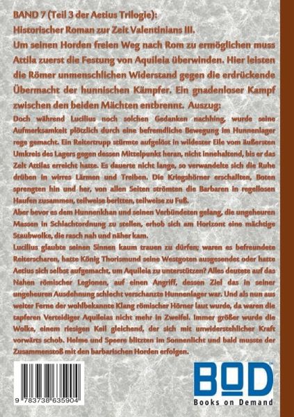 BAND 7 (Teil 3 der Aetius Trilogie): Historischer Roman zur Zeit Valentinians III. Um seinen Horden freien Weg nach Rom zu ermöglichen muss Attila zuerst die Festung von Aquileia überwinden. Hier leisten die Römer unmenschlichen Widerstand gegen die erdrückende Übermacht der hunnischen Kämpfer. Ein gnadenloser Kampf zwischen den beiden Mächten entbrennt. Auszug: Doch während Lucilius noch solchen Gedanken nachhing, wurde seine Aufmerksamkeit plötzlich durch eine befremdliche Bewegung im Hunnenlager rege gemacht. Ein Reitertrupp stürmte aufgelöst in wildester Eile vom äußersten Umkreis des Lagers gegen dessen Mittelpunkt heran, nicht innehaltend, bis er das Zelt Attilas erreicht hatte. Es dauerte nicht lange, so verwandelte sich die Ruhe drüben in wirres Lärmen und Treiben. Die Kriegshörner erschallten, Boten sprengten hin und her, von allen Seiten strömten die Barbaren in regellosen Haufen zusammen, teilweise beritten, teilweise zu Fuß.Aber bevor es dem Hunnenkhan und seinen Verbündeten gelang, die ungeheuren Massen in Schlachtordnung zu stellen, erhob sich am Horizont eine mächtige Staubwolke, die rasch nah und näher kam. Lucilius glaubte seinen Sinnen kaum trauen zu dürfen; waren es befreundete Reiterscharen, hatte König Thorismund seine Westgoten ausgesendet oder hatte Aetius sich selbst aufgemacht, um Aquileia zu unterstützen? Alles deutete auf das Nahen römischer Legionen, auf einen Angriff, dessen Ziel das in seiner ungeheuren Ausdehnung schlecht verschanzte Hunnenlager war. Und als nun aus weiter Ferne der wohlbekannte Klang römischer Hörner laut wurde, da waren die tapferen Verteidiger Aquileias nicht mehr in Zweifel. Immer größer wurde die Wolke, einem riesigen Keil gleichend, der sich mit unwiderstehlicher Kraft vorwärts schob. Helme und Speere blitzten im Sonnenlicht und bald musste der Zusammenstoß mit den barbarischen Horden erfolgen.