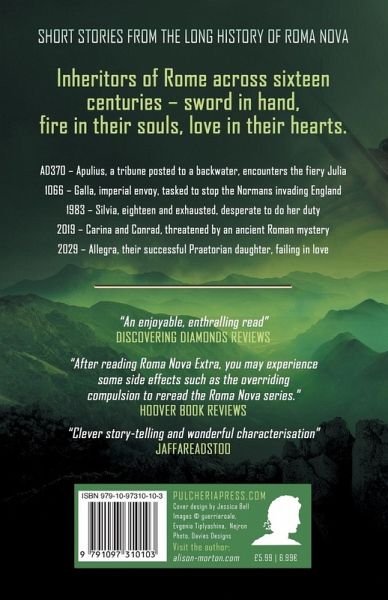 A young tribune at the Roman Empire's dusk meets a fiery daughter of a Celtic prince. Their descendants battle their way through history to the 21st century where they must find their own destiny and happiness while keeping their country safe. Over sixteen hundred years, Roma Nova has seen the brave, the noble, the treacherous, the clever, the chancers, the desperate, the happy and the dutiful who pursue their lives in an enduring Roman society, ruled by women. Eight stories - four historical and four present day, and a little beyond, of the people of Roma Nova. They fight to preserve their way of life, to seek and find love and to do the right thing, just like us.A young Roman tribune is sent to a backwater in 370 AD for practising the wrong religion His lonely sixty-fifth descendant labours in the 1980s to reconstruct her country A Roma Novan imperial councillor attempts to stop the Norman invasion of England in 1066 Her 21st century Praetorian descendant flounders as she searches for her own identity and happiness. The full titles... The Girl from the Market AD 370 Victory Speaks AD 395 A Roman Intervenes 1066 Silvia's story 1987 Games 2011 Conrad and Carina's Roman Holiday 2019 Saturnalia Surprise 2027 Allegra and Macrinus 2029 Readers of the Roma Nova thriller series - INCEPTIO, CARINA, PERFIDITAS, SUCCESSIO, AURELIA, NEXUS, INSURRECTIO and RETALIO - will be familiar with many of the characters in these short stories. But if you are new to Roma Nova, enjoy these eight 'behind the scenes' glimpses into their lives for themselves and perhaps feel curious enough afterwards to find out more about the Roma Novans in the longer novels...