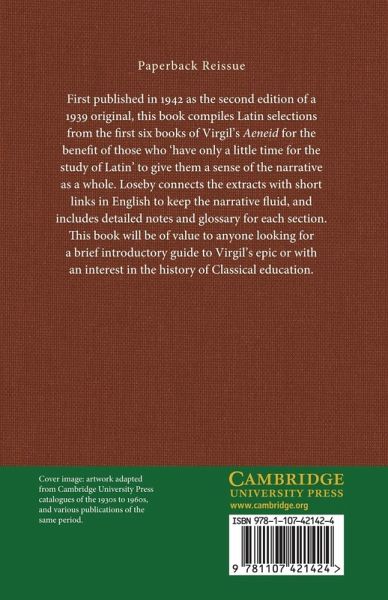 First published in 1942 as the second edition of a 1939 original, this book compiles Latin selections from the first six books of Virgil's Aeneid for the benefit of those who 'have only a little time for the study of Latin' to give them a sense of the narrative as a whole. Loseby connects the extracts with short links in English to keep the narrative fluid, and includes detailed notes and glossary for each section. This book will be of value to anyone looking for a brief introductory guide to Virgil's epic or with an interest in the history of Classical education.