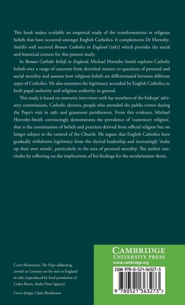 This 1991 book makes available an empirical study of the transformations in religious beliefs that have occurred amongst English Catholics. It complements Dr Hornsby-Smith's well received Roman Catholics in England (1987) which provides the social and historical context for this present study. In Roman Catholic beliefs in England, Michael Hornsby-Smith explores Catholic beliefs over a range of concerns from doctrinal matters to questions of personal and social morality and assesses how religious beliefs are differentiated between different types of Catholics. He also examines the legitimacy accorded by English Catholics to both papal authority and religious authority in general.