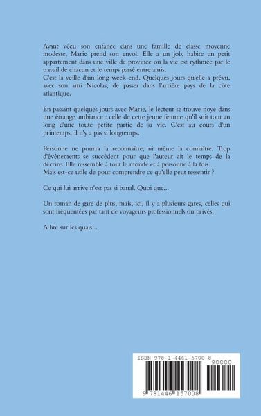 Ayant vécu son enfance dans une famille modeste, Marie prend son envol. Elle a un job, habite un petit appartement dans une ville de province où la vie est rythmée par le travail de chacun et le temps passé entre amis. C'est la veille d'un long week-end. Quelques jours qu'elle a prévu, avec son ami Nicolas, de passer dans l'arrière pays de la côte atlantique. En passant quelques jours avec Marie, le lecteur se trouve noyé dans une étrange ambiance : celle de cette jeune femme qu'il suit tout au long d'une toute petite partie de sa vie. C'est au cours d'un printemps, il n'y a pas si longtemps. Personne ne pourra la reconnaître, ni même la connaître. Trop d'événements se succèdent pour que l'auteur ait le temps de la décrire. Elle ressemble à tout le monde et à personne à la fois. Mais est-ce utile de la connaître pour comprendre ce qu'elle peut ressentir ? Ce qui lui arrive n'est pas si banal. Quoi que... Un roman de gare de plus, mais, ici, il y a plusieurs gares... A lire sur les quais...