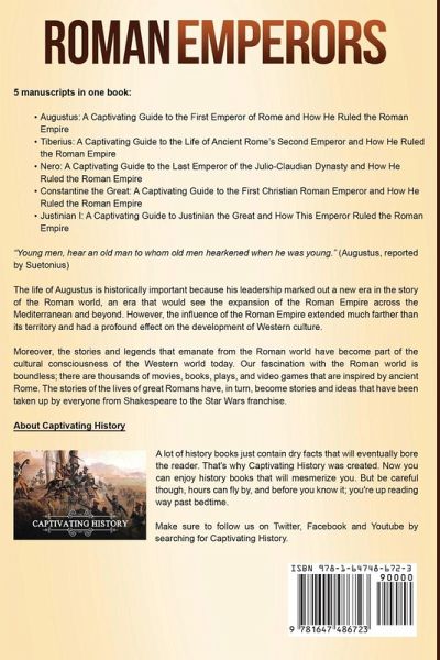 If you want to discover the captivating lives of five Roman Emperors, then keep reading... Five captivating manuscripts in one book: Augustus: A Captivating Guide to the First Emperor of Rome and How He Ruled the Roman Empire Tiberius: A Captivating Guide to the Life of Ancient Rome’s Second Emperor and How He Ruled the Roman Empire Nero: A Captivating Guide to the Last Emperor of the Julio-Claudian Dynasty and How He Ruled the Roman Empire Constantine the Great: A Captivating Guide to the First Christian Roman Emperor and How He Ruled the Roman Empire Justinian I: A Captivating Guide to Justinian the Great and How This Emperor Ruled the Roman Empire Part 1 of this book covers the life of Augustus and here are some of the topics included: Rome The Early Years Early Career Caesar’s Son The Road to Actium Augustus The Birth of an Empire Imperator Death and Legacy And much, much more! Part 2 of this book covers the life of Tiberius and here are some of the topics included: Before the Emperors Born into Turmoil The Eye of the Emperor In the Shadow of Augustus First Conquest Forced Marriage Rock Bottom Ascension A Slippery Slope to Capri The Last Javelin And much, much more! Part 3 of this book covers the life of Nero and here are some of the topics included: The First Emperors Exile Agrippina Pulls the Strings Matricide Right off the Rails Rome Ablaze Regret The Last Killing And much, much more! Part 4 of this book covers the life of Constantine the Great and here are some of the topics included: The Early Life of Constantine the Great Early Rule Civil Wars Constantine, the Lavish Administrator The Man behind the Emperor Constantinople Constantine and Christianity Late Rule and Death And much, much more! Part 5 of this book covers the life of Justinian I and here are some of the topics included: Early Life Empress Theodora Rebellion, Riot, and Rebuilding Corpus Juris Civilis Expansion of the Empire Religion Life under Justinian The Decline of Justinian Legacy And much, much more! So if you want to learn more about the lives of these five Roman Emperors, scroll up and click the "add to cart" button!