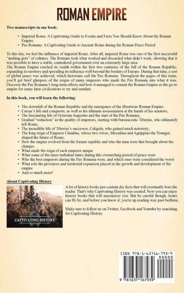Two manuscripts in one book: Imperial Rome: A Captivating Guide to Events and Facts You Should Know About the Roman Empire Pax Romana: A Captivating Guide to Ancient Rome during the Roman Peace Period To this day, we feel the influence of imperial Rome. After all, imperial Rome was one of the first successful "melting pots" of cultures. The Romans took what worked and discarded what didn't work, showing that it was possible to have a stable, centralized government over an extremely large area. In the first part of this book, you learn includes the following: The downfall of the Roman Republic and the emergence of the illustrious Roman Empire; Caesar's life and conquests, as well as his ultimate assassination at the hands of his senators; The fascinating life of Octavian Augustus and the start of the Pax Romana; Gradual "reduction" in the quality of emperors, starting with bureaucratic Tiberius, who ultimately left Rome; The incredible life of Tiberius's successor, Caligula, who gained much notoriety; The long reign of Emperor Claudius, whose two wives, Messalina and Agrippina the Younger, shaped the future of Rome; Nero, who (maybe) set Rome on fire and who was most certainly a very unusual emperor with a penchant for the arts; The Flavians and the Five Good Emperors, who led imperial Rome into its most prolific period; The gradual but consistent erosion of traditional Roman values and its ultimate dissolution into early medieval Europe; The Roman Empire reached its zenith within the first two centuries of the fall of the Roman Republic, expanding its territory and spreading its influence well beyond the borders of Europe. During that time, a sort of global peace was achieved, which historians call the Pax Romana. Throughout the pages of this tome, you'll get brief glimpses of the reigns of many emperors who made the Pax Romana into what it was. Discover the Pax Romana's long-term effects and how it managed to cement the Roman Empire as the go-to empire for many later civilizations to try and emulate. In the second part of this book, you'll gain new knowledge on the following facts: How the empire evolved from the former republic and who the men were that brought about the changes What made the reign of each emperor unique What some of the more turbulent times during this overarching period of peace were Who the best emperors during the Pax Romana were, and which ones were considered the worst What role the provinces and territorial expansion played in the growth and development of the empire How the imperial Romans were stratified What societal changes came about with the abolition of the republic and the return to a monarchic model How the everyday Romans lived during the Pax Romana How big of a role the Roman army played in maintaining the peace How prominent the Senate was and whether or not its role was diminished or reinforced during certain periods of the Pax Romana And so much more!
