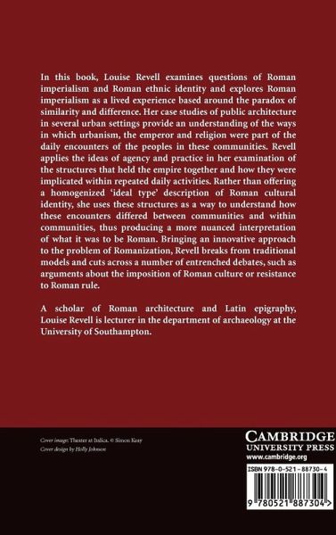 In this book, Revell examines questions of Roman ethnic identity and explores Roman imperialism as a lived experience based around the paradox of similarity and difference. Her case studies of public architecture provide an understanding of how urbanism, the emperor and religion were part of the daily encounters of these communities. Revell applies the ideas of agency and practice in her examination of the structures that held the empire together and how they were implicated within repeated daily activities. Rather than offering a homogenised 'ideal type' description of Roman cultural identity, she uses these structures as a way to understand how encounters differed between communities, thus producing a more nuanced interpretation of what it was to be Roman. Bringing an innovative approach to the problem of Romanisation, Revell breaks from traditional models, cutting across a number of entrenched debates such as arguments about the imposition of Roman culture or resistance to Roman rule.