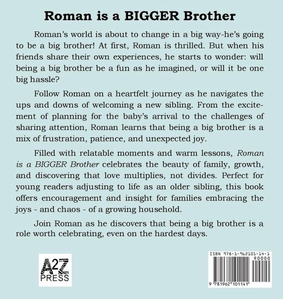 Roman's world is about to change in a BIG way- he's going to be a big brother! At first, Roman is thrilled but when his friends share their own experiences, he starts to wonder: will being a big brother be as he imagined or will it be one big hassle? One of Roman's friends tell him how wonderful it is to be a big brother and another says 'not so much.' Roman wonders how it will really be to be a BIGGER brother. When mom goes to the hospital to have the new arrival, Roman and Harley find that being a BIGGER brother is very fun and rewarding. Come, see how Roman becomes a BIGGER brother.