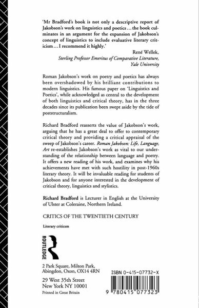 Richard Bradford reasserts the value of Jakobson's work, arguing that he has a great deal to offer to contemporary critical theory and providing a critical appraisal of the sweep of Jakobson's career.