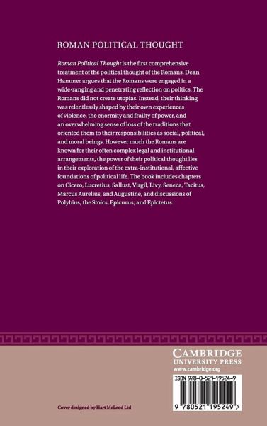 Roman Political Thought is the first comprehensive treatment of the political thought of the Romans. Dean Hammer argues that the Romans were engaged in a wide-ranging and penetrating reflection on politics. The Romans did not create utopias. Instead, their thinking was relentlessly shaped by their own experiences of violence, the enormity and frailty of power, and an overwhelming sense of loss of the traditions that oriented them to their responsibilities as social, political, and moral beings. However much the Romans are known for their often complex legal and institutional arrangements, the power of their political thought lies in their exploration of the extra-institutional, affective foundations of political life. The book includes chapters on Cicero, Lucretius, Sallust, Virgil, Livy, Seneca, Tacitus, Marcus Aurelius, and Augustine, and discussions of Polybius, the Stoics, Epicurus, and Epictetus.
